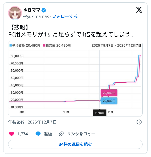 1ヶ月足らずでPC用のメモリ価格が4倍以上に高騰し、来年以降のパソコンやスマートフォン価格に関する不穏なニュースが飛び交っています