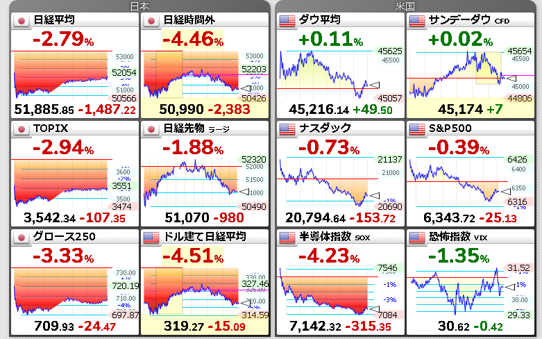 半導体指数の下げが大きく日経平均先物の下げも大きくなっている