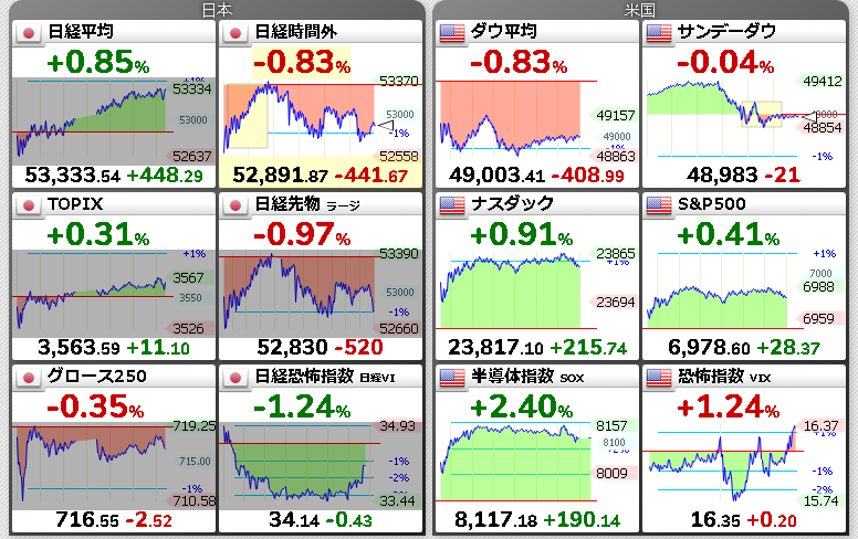 S&P500+0.41%、ナスダック100+0.88%、半導体指数+2.40%