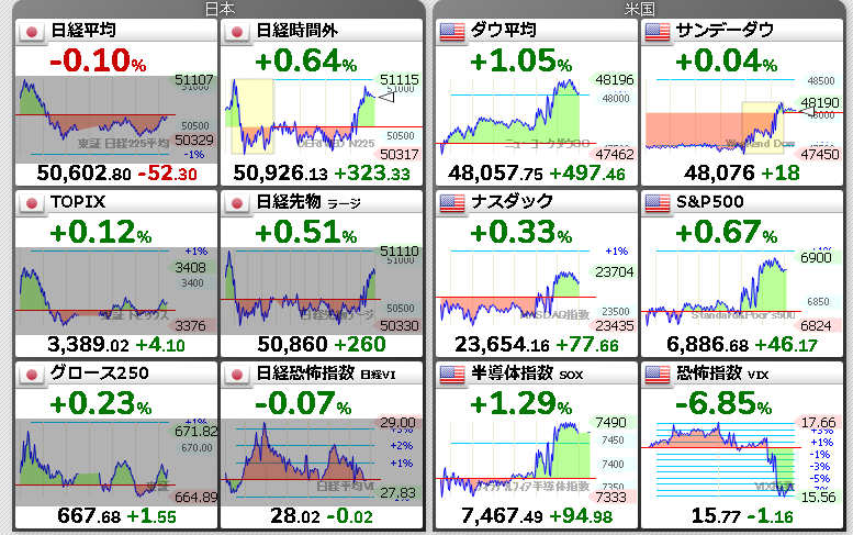 半導体指数も+1.29%だが個別株ではエヌビディア-0.64%、マイクロソフト-2.74%、メタ-1.04%、アーム-0.29%など下落も多い