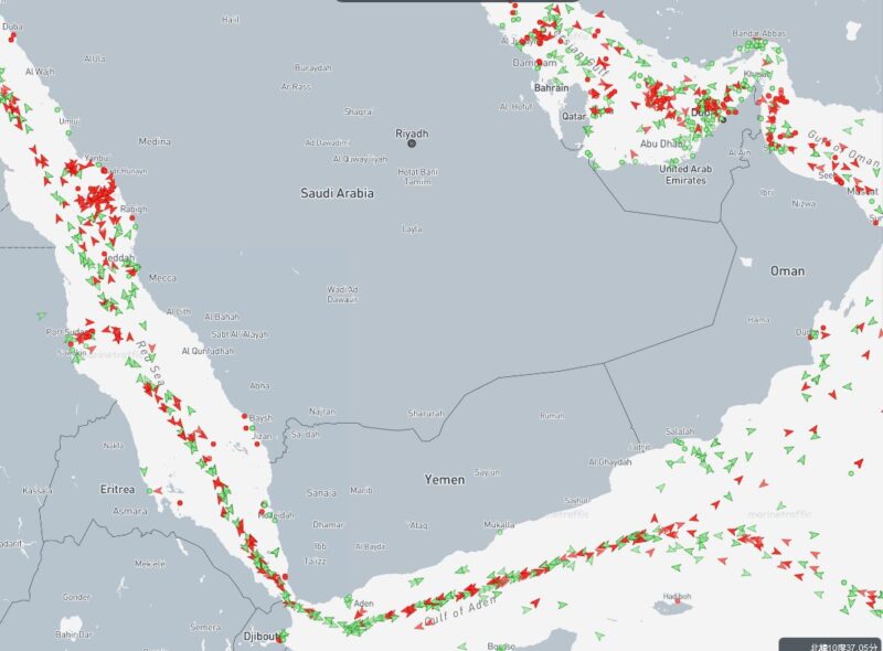 ホルムズ海峡はペルシャ湾の外の船は少なくなった→紅海へ移ったのではないか?