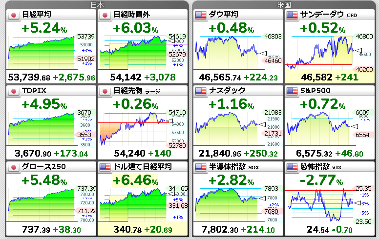 米個別株ではマイクロン+8.88%、サンディスク+9.03%、インテル+8.84%とメモリ・チップ株が大きく上昇していた