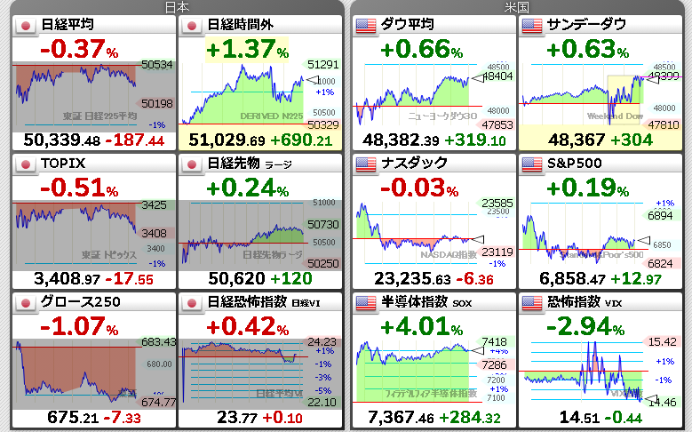 米国個別株:エヌビディア+1.26%、マイクロソフト-2.21%、メタ-1.47%、アマゾン-1.87%、テスラ-2.59%、パランティア-5.56%、サンディスク+15.95%、アーム+4.96%、マイクロン+10.51%など
