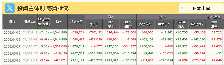 先週は日経平均が+7.15%と爆上げした週 海外勢の爆買いが続いていた