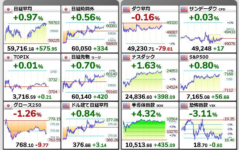 昨日のアメリカ市場はインテル+23.6%(決算発表受けて)、アーム(ソフバンG子会社)+14.76%、AMD+13.91%、クアルコム+11.12%、サンディスク+6.16%、エヌビディア+4.32%など