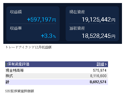 2022年 12月約+34.6万円計9,640,191円・SBI証券他資産約584万円