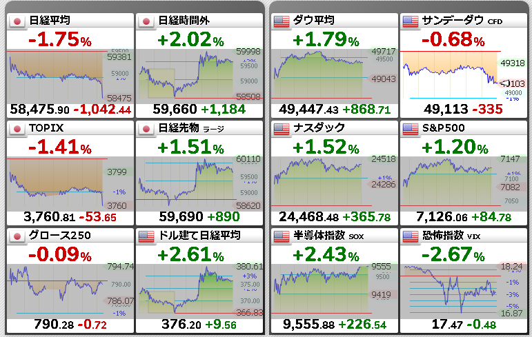 金曜日(土曜早朝の引け)、日経平均先物は+890円だったが、その後サンデーダウは-0.68%と下落