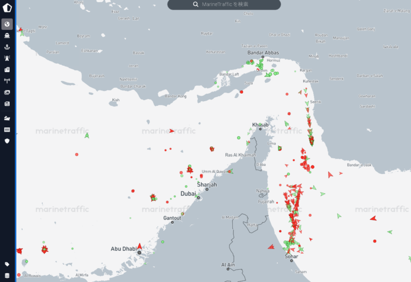 ホルムズ海峡の封鎖は続いており、ごくわずかの船のみ航行できているようす